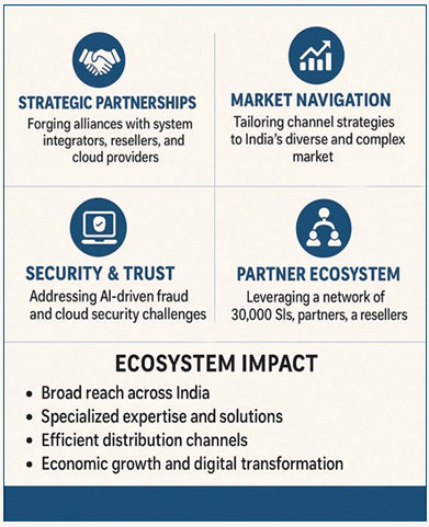 India’s partner ecosystem is massive, comprising nearly 30,000 businesses, including system integrators, solution partners, distrib- utors, sub-distributors, and resellers. Together, they form the back- bone of technology adoption in the country. This ecosystem ensures: