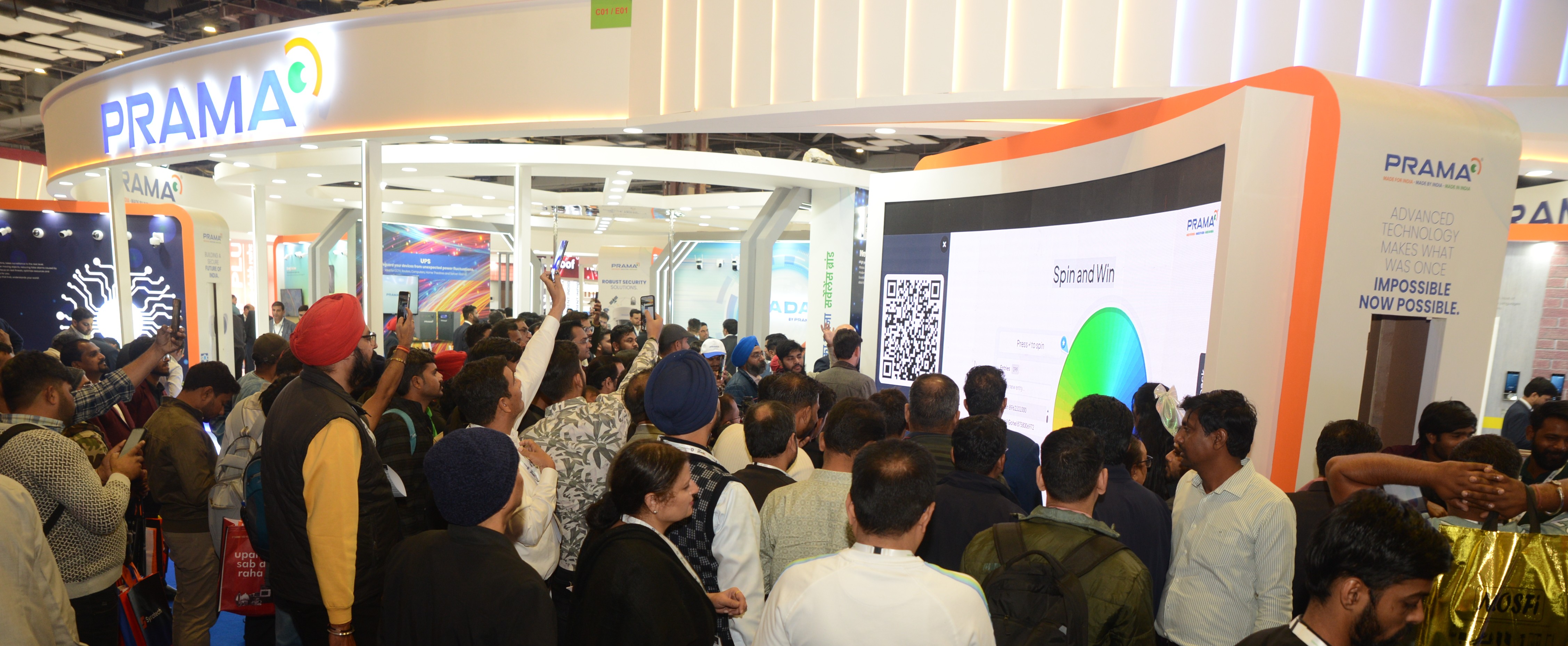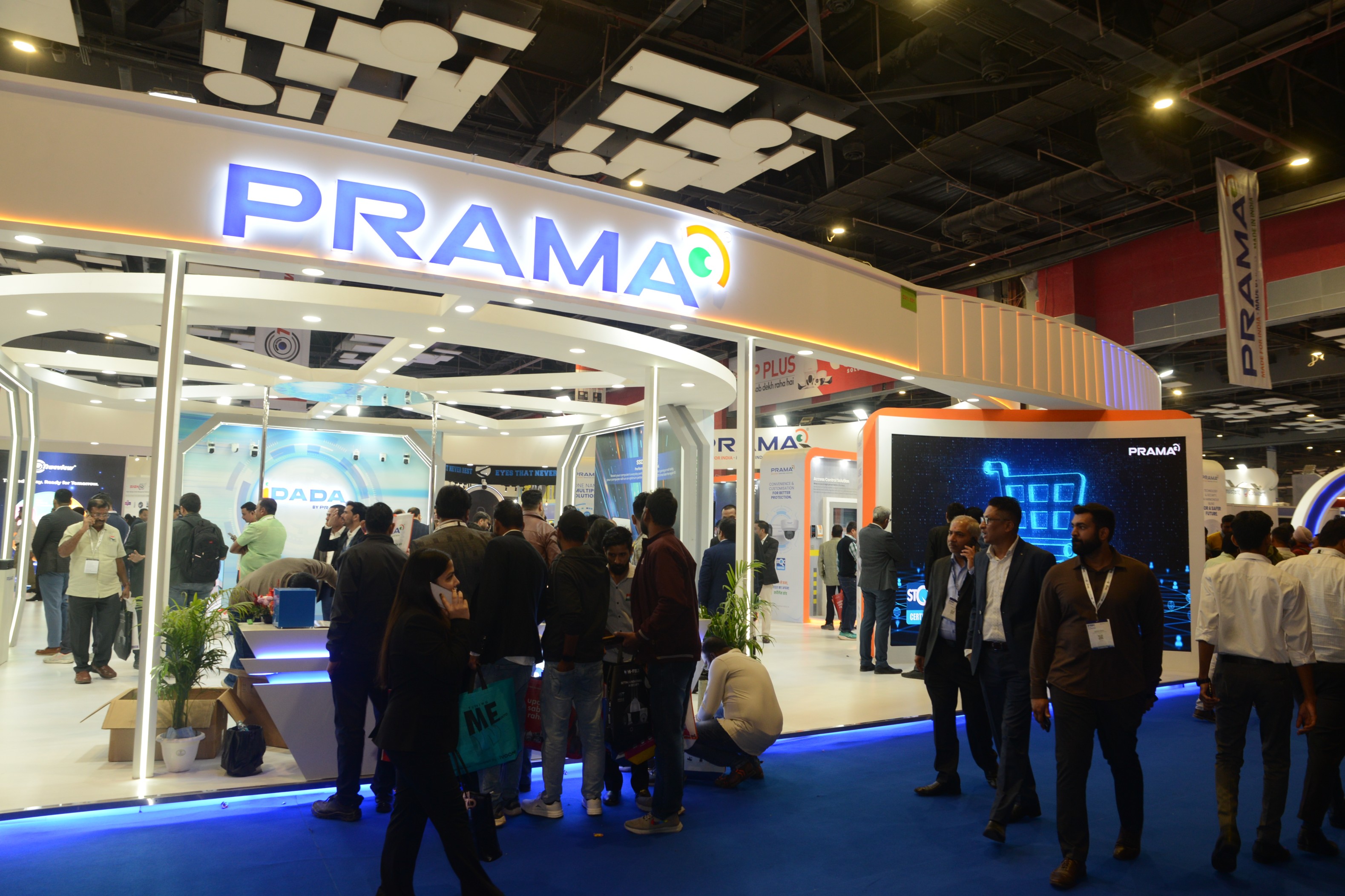 The ornately designed spacious PRAMA booth showcases vertical solution walls on Retail Solution, Home Solution, Defence Solution, Safe City Solution, Smart Mobile Solution, Education Solution, Healthcare Solution, Hospitality Solution, and Transportation Solution, etc.
